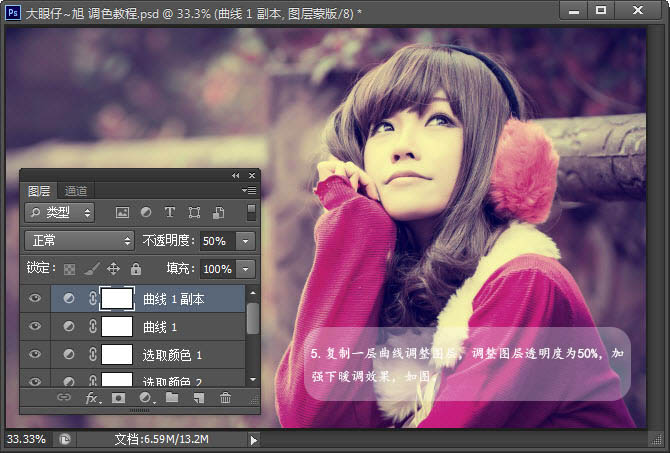 5、复制一层曲线调整图层,调整图层透明度为50%,加强下暖调效果,如图。
