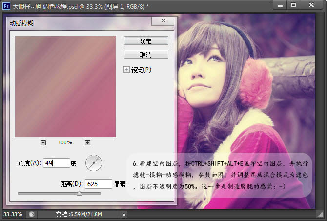 6、新建空白图层,按CTRL+SHIFT+ALT+E盖印空白图层,并执行滤镜-模糊-动感模糊,参数如图。并调整图层混合模式为滤色,图层不透明度为50%。这一步是制造朦胧的感觉。