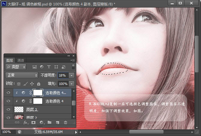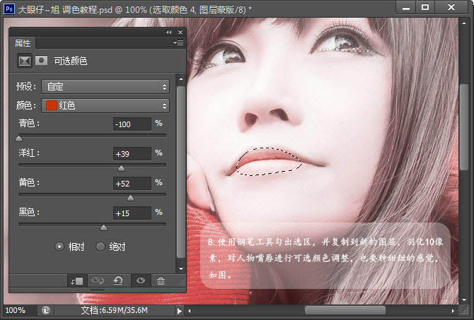8、使用钢笔工具勾出选区,并复制到新的图层,羽化10像素,对人物嘴唇进行可选颜色调整,也要种甜甜的感觉,如图。