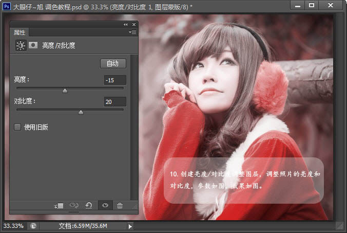 10、创建亮度/对比度调整图层,调整照片的亮度和对比度,参数如图,效果如图。