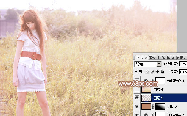 7、按Ctrl + Alt + 2 调出高光选区,按Ctrl + Shift + I 反选,新建一个图层填充黄褐色:#BF8869,混合模式改为“滤色”,不透明度改为:30%,效果如下图。这一步增加图片暗部亮度。