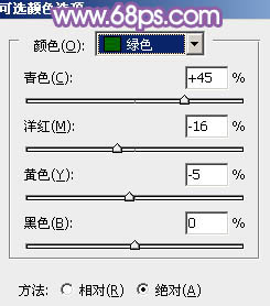3、创建可选颜色调整图层,对红、黄、绿、白、黑进行调整,参数设置如图7 - 11,效果如图12。这一步给图片的高光部分增加淡蓝色,并增加图片绿色。