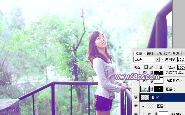 9、按Ctrl + Alt + 2 调出高光选区,按Ctrl + Shift + I 反选,新建一个图层填充暗紫色:#8B569F,混合模式改为“滤色”,不透明度改为:10%,效果如下图。这一步适当增加图片暗部亮度。