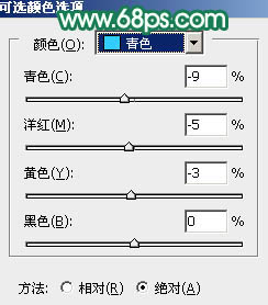 11、创建可选颜色调整图层,对绿、青、白、黑进行调整,参数设置如图20 - 23,确定后用黑色画笔把人物部分擦出来,效果如图24。这一步微调背景部分的颜色。
