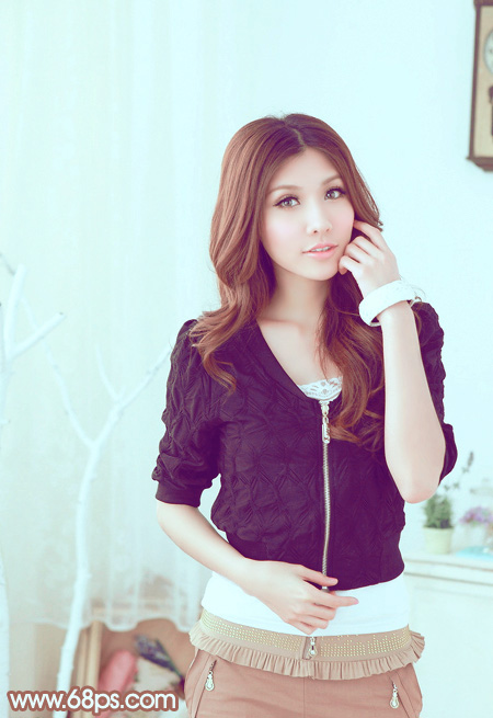 素材图片以淡黄色为主,转为淡蓝色也非常快。只需要把淡黄色转为淡蓝色,然后加强高光部分的颜色,再把人物肤色调红润即可。