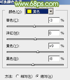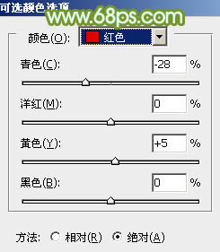 4、创建可选颜色调整图层,对红、黄、绿进行调整,参数设置如图10 - 12,效果如图13。这一步给图片增加一些橙黄色。