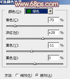 1、打开原图素材,创建可选颜色调整图层,对黄,绿进行调整,参数设置如图1,2,效果如图3。这一步给图片的背景增加橙黄色。
