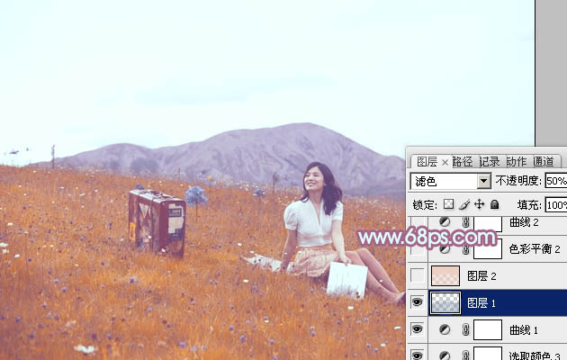 6、按Ctrl + Alt + 2 调出高光选区,按Ctrl + Shift + I 反选,新建一个图层填充暗蓝色:#7591AA,混合模式改为“滤色”,不透明度改为:50%,效果如下图。这一步适当增加图片暗部亮度。