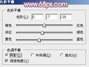 8、创建色彩平衡调整图层,对阴影、中间调、高光进行调整,参数设置如图24 - 26,效果如图27。这一步微调暗部及高光部分的颜色。