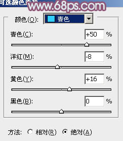 6、再创建可选颜色调整图层,对黄、青、黑进行调整,参数设置如图20 - 22,效果如图23。这一步给地面部分增加橙黄色,天空部分增加淡青色。
