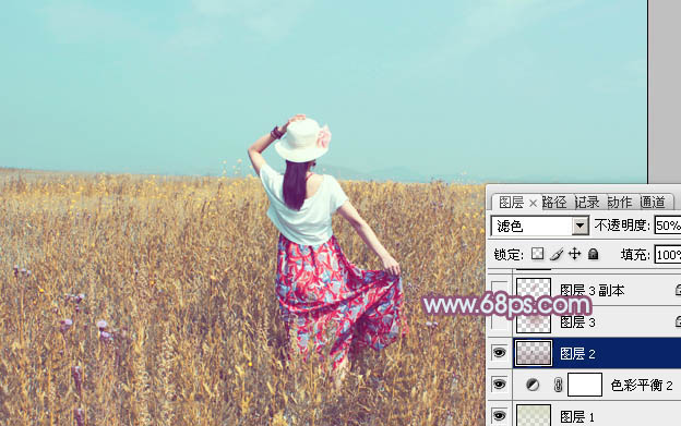 10、按Ctrl + Alt + 2 调出高光选区,按Ctrl + Shift + I 反选,新建一个图层填充暗红色:#6E2A40,混合模式改为“滤色”,不透明度改为:50%,效果如下图。这一步给图片的暗部增加红褐色。