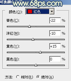 6、创建可选颜色调整图层,对红、黄、青、黑进行调整,参数设置如图16 - 19,效果如图20。这一步主要给图片增加红色。