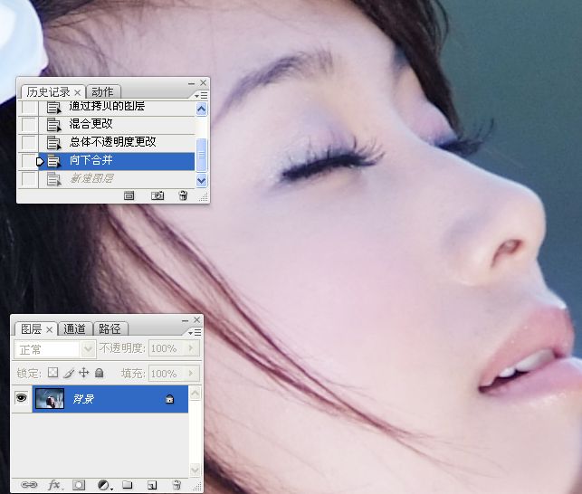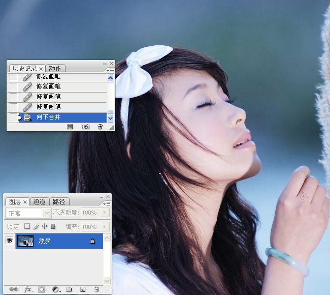 2、向下合并图层,新建一空白图层,使用修复画笔工具清除皮肤污点。然后合并图层。