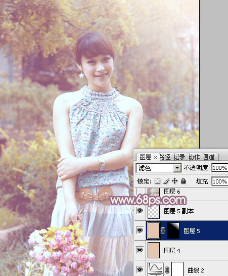 12、新建一个图层填充淡黄色:#E2C6AE,混合模式改为“滤色”,按住Alt键添加图层蒙版,用白色画笔把右上角部分擦出来,给图片增加高光,效果如下图。