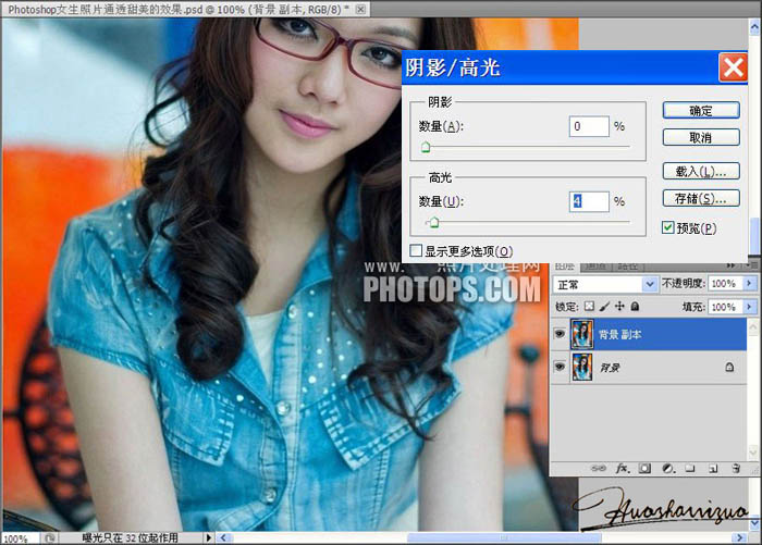 1、打开原图,复制一层,执行:图像--调整--阴影/高光,参数如图,恢复过亮部分的一些细节。