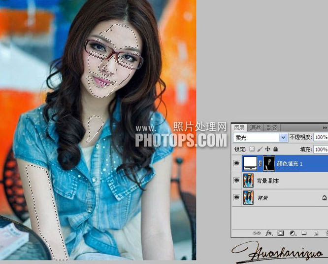 2、按Ctrl+Alt+2调出高光选区,新建纯色填充图层,填充白色,图层混合模式:柔光,用黑色画笔把皮肤之外的部分擦掉,右边手臂过曝的也要擦掉。这一步是把皮肤提亮。