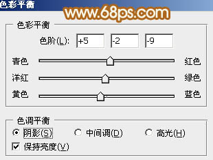 7、创建色彩平衡调整图层,对阴影、中间调、高光进行调整,参数设置如图18 - 20,确定后把蒙版填充黑色,用白色画笔把人物脸部及肤色部分擦出来,效果如图21。这一步给肤色部分增加一些红褐色。