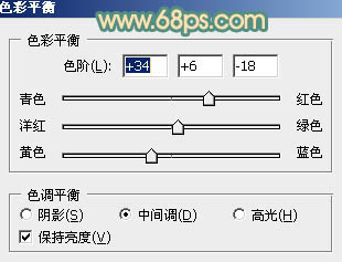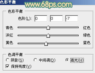 8、调出当前图层蒙版选区,创建色彩平衡调整图层,对阴影、中间调、高光进行调整,参数设置如图17 - 19,效果如图20。这一步给人物部分增加暖色。