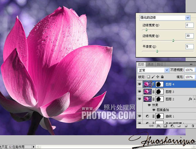 7、盖印图层,执行:滤镜--画笔描边--强化的边缘,参数如图,确定后添加图层蒙版,用黑色画笔把荷花擦出来。