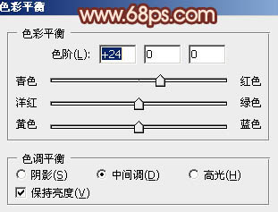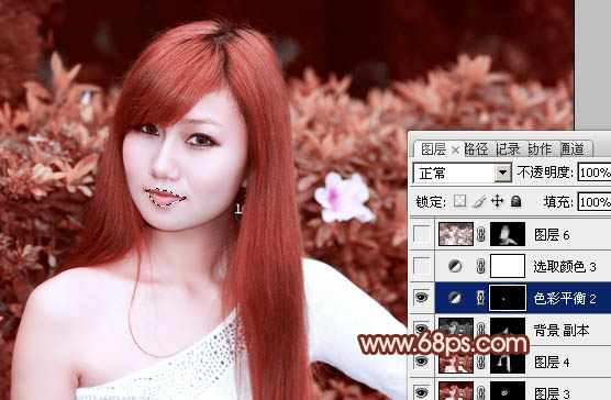 8、用钢笔把人物嘴唇部分选取出来,羽化1个像素后创建色彩平衡调整图层,稍微调红润一点,参数设置如图17,18,效果如图19。
