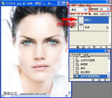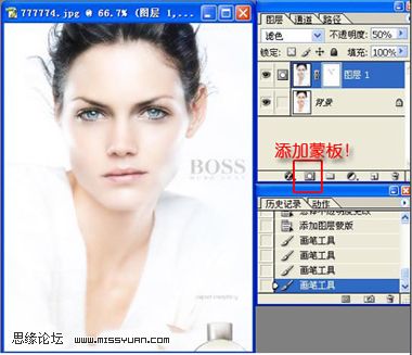9、再把图层1设置为滤色。把不透明度调至50%左右。再给图层1添加蒙板。用颜色为黑色画笔,把眼睛鼻子,嘴等稍擦拭清楚眯。注意笔力度调小点,这样才过渡自然。