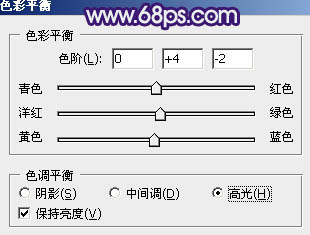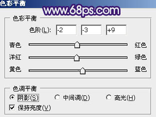 4、创建色彩平衡调整图层,对阴影、中间调、高光进行调整,参数设置如图10 - 12,效果如图13。这一步主要给图片的暗部增加蓝色。