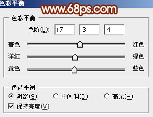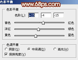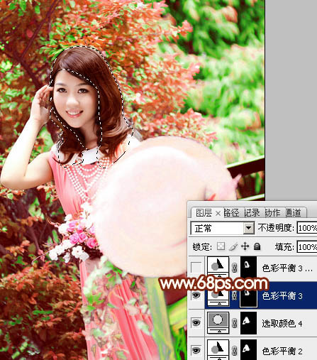 7、调出当前图层蒙版选区,创建色彩平衡调整图层,对阴影,中间调进行调整,参数设置如图17,18,效果如图19。这一步把人物肤色稍微调红润一点。