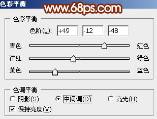 8、创建色彩平衡调整图层,对中间调进行调整,参数设置如图20,确定后把蒙版填充黑色,用白色画笔把头发部分擦出来,效果如图21。这一步改变头发颜色,增加一些橙黄色。