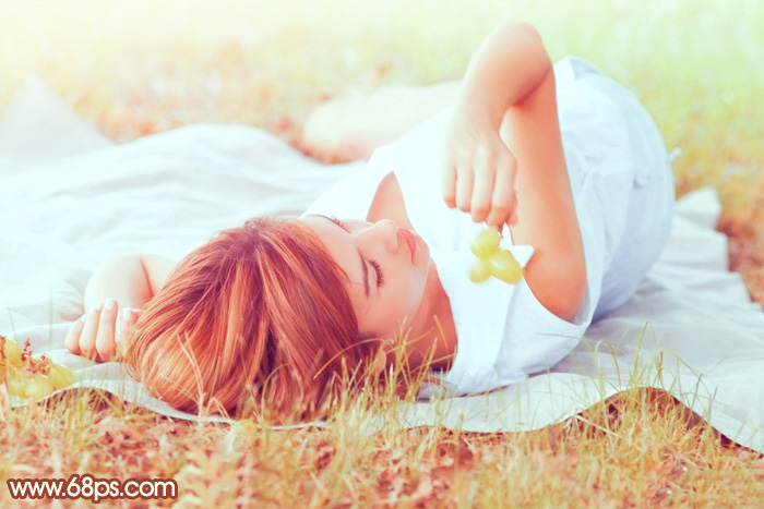 素材图片颜色有点偏灰,草地颜色不够鲜丽,看上去有点脏。处理的时候,可以给整体增加一些淡红色,高光部分再增加一些黄绿色。这样人物看上去甜美,画面也清爽一点。