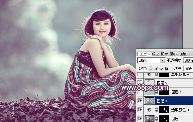 10、按Ctrl + Alt + 2调出高光选区,按Ctrl + Shift + I 反选。新建一个图层填充暗紫色:#3E1638,混合模式改为“滤色”,效果如下图。这一步增加图片暗部亮度。