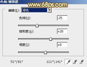1、打开素材图片,创建色相/饱和度调整图层,对绿色进行调整,参数设置如图1,效果如图2。这一步把图片中的绿色转为黄绿色。