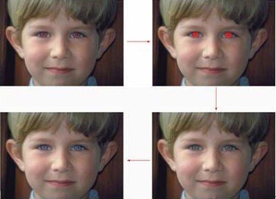 创作思路 打开一张红眼的照片,运用【快速蒙版】选出眼睛的选区,使用【去色】命令进行快速消除红眼,最后使用【曲线】工具把眼睛调整为淡蓝色。整个操作流程如图 所示。
