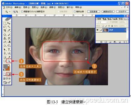(1) 工具选用。下面将详细介绍如何运用 Photoshop CS 的各种工具来完成本实例的各个步骤,完成消除红眼的整个操作过程。