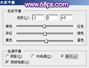 8、调出当前图层蒙版选区,创建色彩平衡调整图层,对中间,高光进行调整,参数设置如图23,24,确定后把图层不透明度改为:50%,效果如图25。这一步同上,增加肤色蓝色跟背景融合。