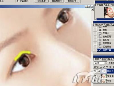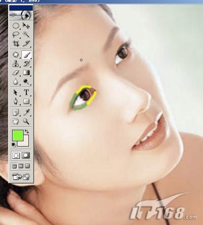 在上眼处涂上颜色,据说今年流行黄色和青色搭配的眼影,所以我们也要试试,(当然也可按自己喜好来选眼影的颜色。)将色涂到一半,如图3所示: