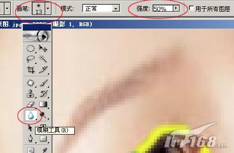 第二步:使用工具栏中的模糊工具,将它的属性调至大小为13(糊)、强光为50%,如图5所示: