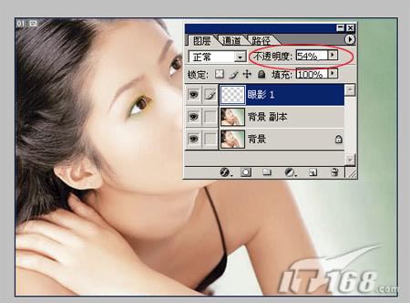 然后将其的透明度调整小,我的是54%,这个也可根据自己喜欢来调,一个眼睛的眼影就完成了,如图7所示: