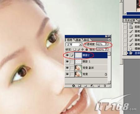 按照刚才制作“眼影1”的方法将另外一个眼睛也来涂上眼影:新建一个图层命名为“眼影2”,画笔工具将颜色涂上,然后使用模糊工具,最后将透明度调整好,这样我们的眼影部分就已经完成了。如图8所示: