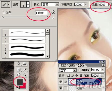 还是使用画笔工具,将画笔的属性调至大小为1(精),流量为60%,如图10所示: