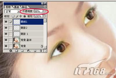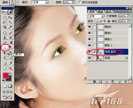 眼睛的操作都其本上已经完成了,但刚刚可能由于在画眼影使用模糊工具时会把颜色弄到眼珠上,我们可以回到眼影图层中使用橡皮擦工具把多余的颜色擦除,然后在背景副本中将眼眼锐化一下,这样会显得更有精神,如图14所示: