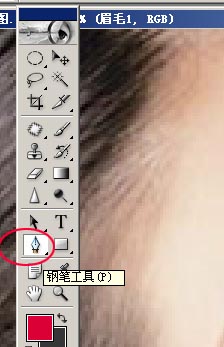 描眉的操作也很简单,重在调整透明度。新建一个图层命名为“眉1”,使用刚笔工具将眉形大概选取出来,如图15所示: