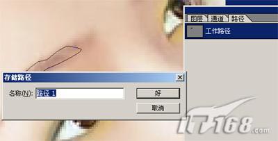 在路径面版中将刚才所描出来的“工作路径”储存为“路径1”:双击“工作路径”便会弹出一个路径对话框,点击“好”便可,如图16所示: