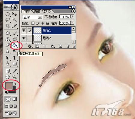 将“路径1”双击转换为选区,羽化2个像素,再选择一个与原图片眉毛相近的颜色,使用填充工具,将刚才所选的眉毛填色,如图17所示: