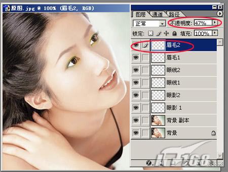 然后将其的透明度调整一下就好,这样我们描眉就完成了。最后,利用相同的方法将第二个眼睛上的眉毛加深一下颜色:新建一个图层命名为“眉2”,钢笔选中、羽化选区、调整透明度,第三部分也完成了,如图18所示: