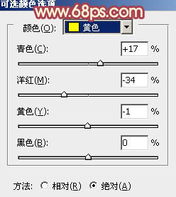 8、创建可选颜色调整图层,对黄色进行调整,参数设置如图20,确定后用黑色画笔把人物部分擦出来,效果如图21。这一步把背景部分主色转为黄绿色。