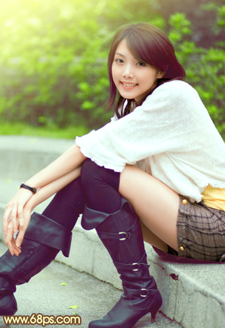 素材图片背景背景颜色有点沉,处理的时候可以考虑增加一些鲜嫩的颜色,如黄绿色等。人物部分可以按需要稍微调红润一点。最后渲染一下高光即可。