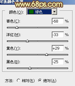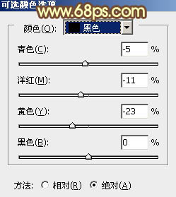 4、再创建可选颜色调整图层,对黄、绿、黑进行调整,参数设置如图10 - 12,效果如图13。这一步把背景背景的暗绿色调鲜艳一点。