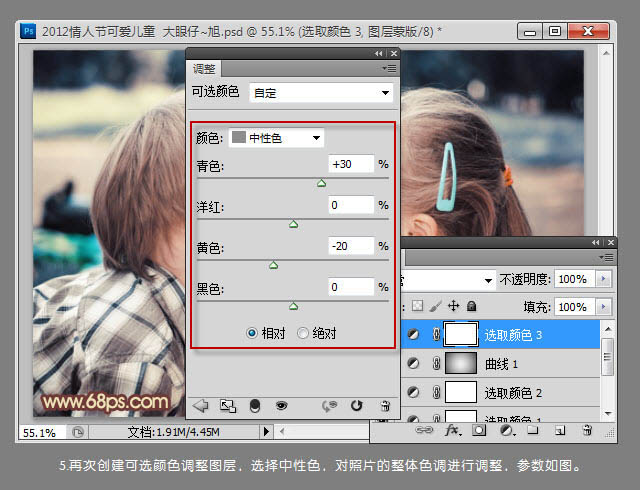 5、再次创建可选颜色调整图层,选择中性色,对照片的整体色调进行调整,参数及效果如下图。