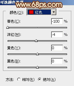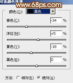 5、再创建可选颜色调整图层,对红、黄、绿、青、白、黑进行调整,参数设置如图14 - 19,确定后用黑色画笔把人物裙子及脚部区域擦出来,效果如图20。这一步主要增加头发等暗部区域的红色。