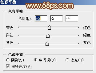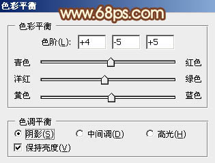 11、创建色彩平衡调整图层,对阴影、中间调、高光进行调整,参数设置如图29 - 31,确定后把图层不透明度改为:60%,效果如图32。这一步微调暗部及高光部分的颜色。